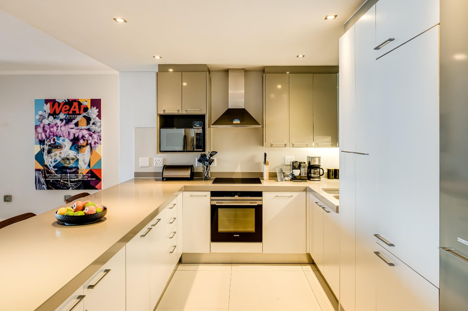 The kitchen is fully equipped, complementing the lounge and dining areas. With building security, a doorman, a commubnal swimming pool and located 5 minutes from the Camps Bay Promenade and Table Mountain Cableway, Crystalline Bay provides a base in one of Cape Town’s most sought-after neighbourhoods.