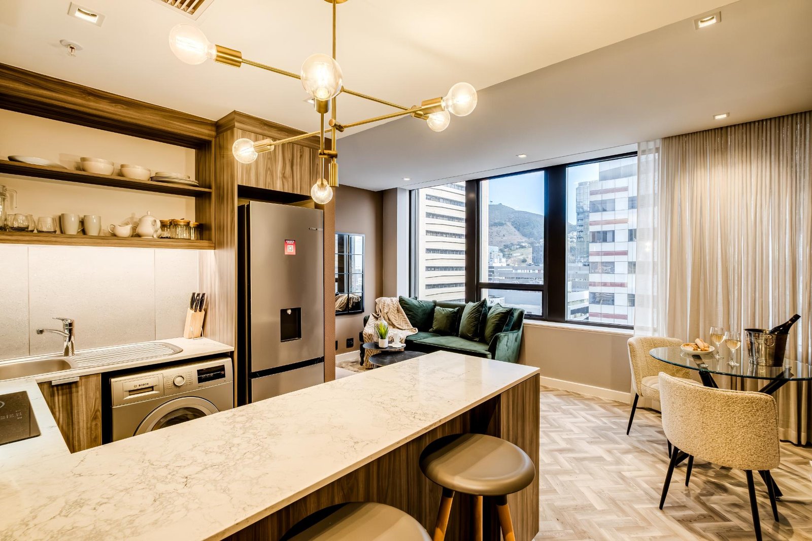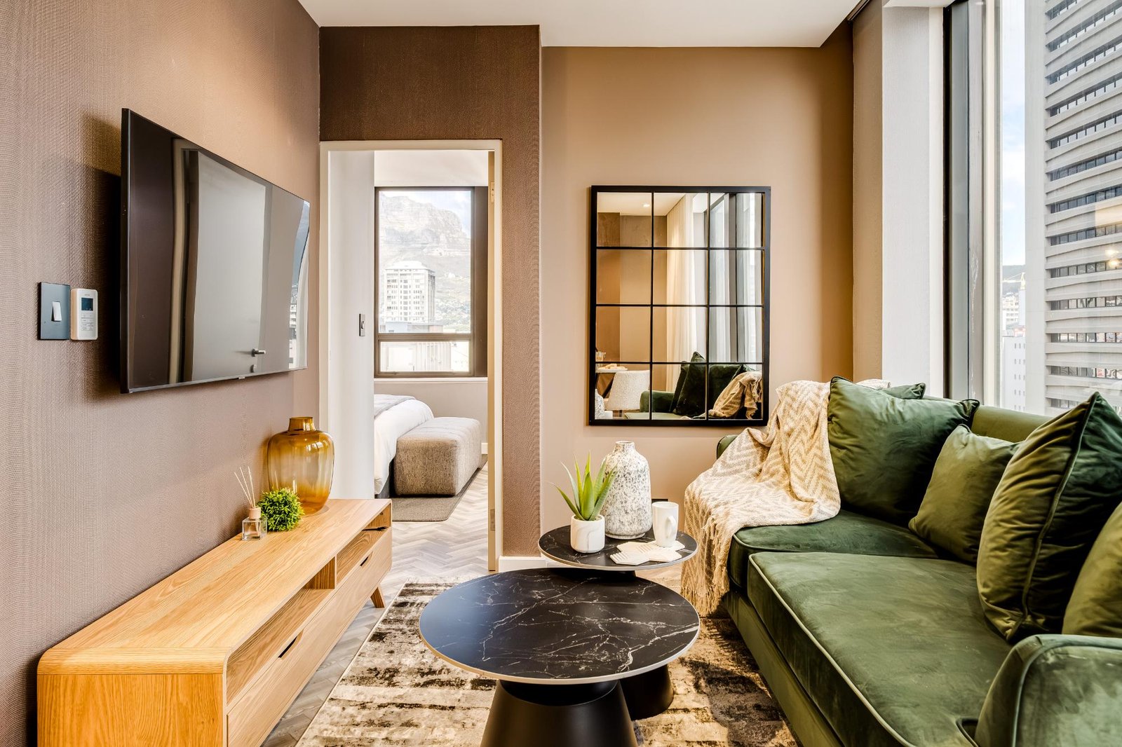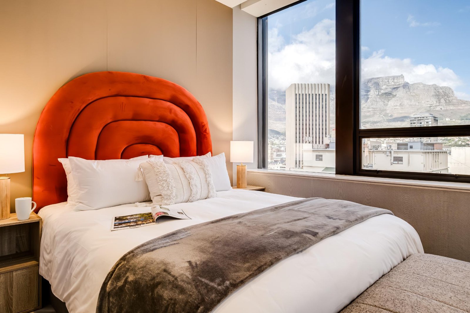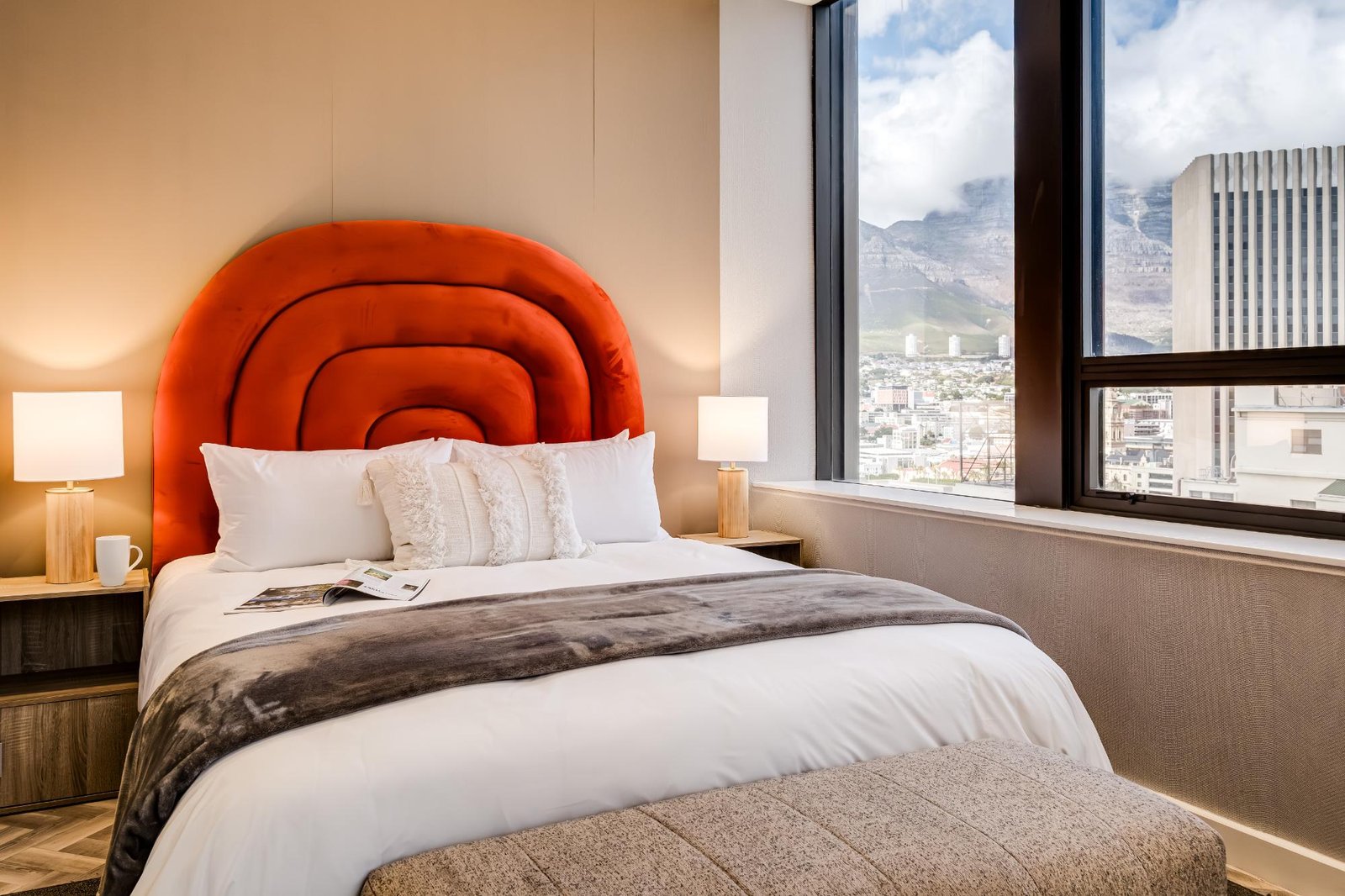 Set high above the vibrant streets of Cape Town’s city centre, City Suite 1601 offers a refined escape ideal for business travellers and couples. The apartment is thoughtfully designed for comfort and ease, with a sleek open-plan living and dining area featuring central air conditioning, a TV, and seating for two. The kitchen includes an electric hob, Nespresso machine, washer, and a breakfast bar for two. The bedroom, with a queen bed and an ensuite, enjoys views of Table Mountain and the city skyline. With a doorman on site and full loadshedding protection, this well-located suite provides a calm, uninterrupted stay in the heart of Cape Town’s business and cultural district.