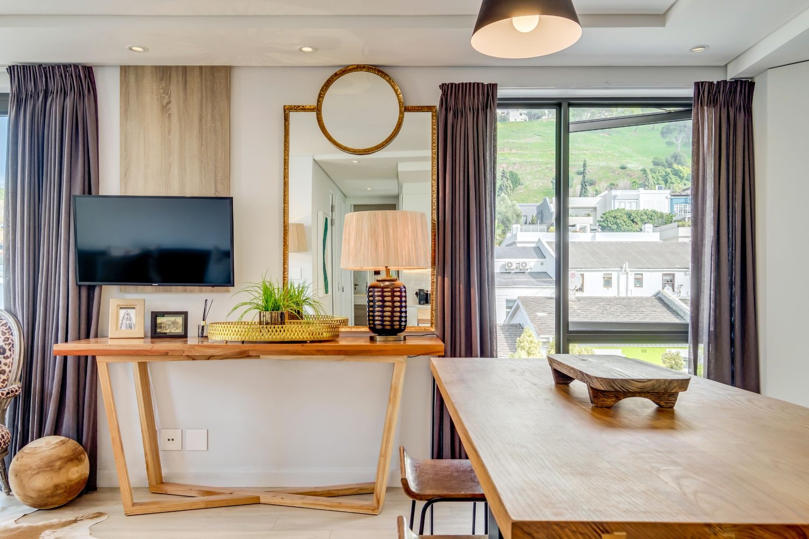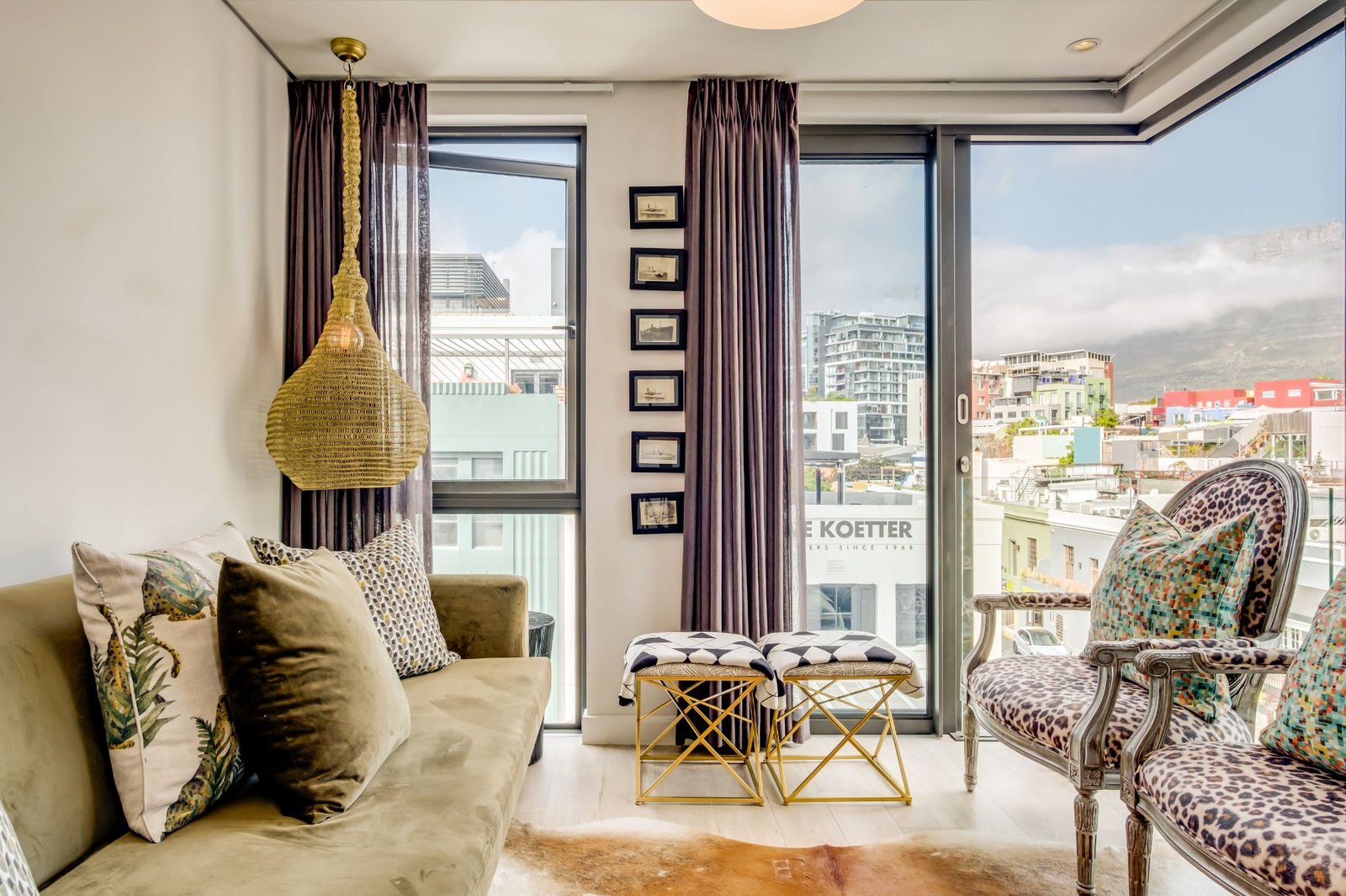 The living spaces are decorated with stylish finishings and are very comfortable. There are large glass doors that open wide and show off Table Mountain.
