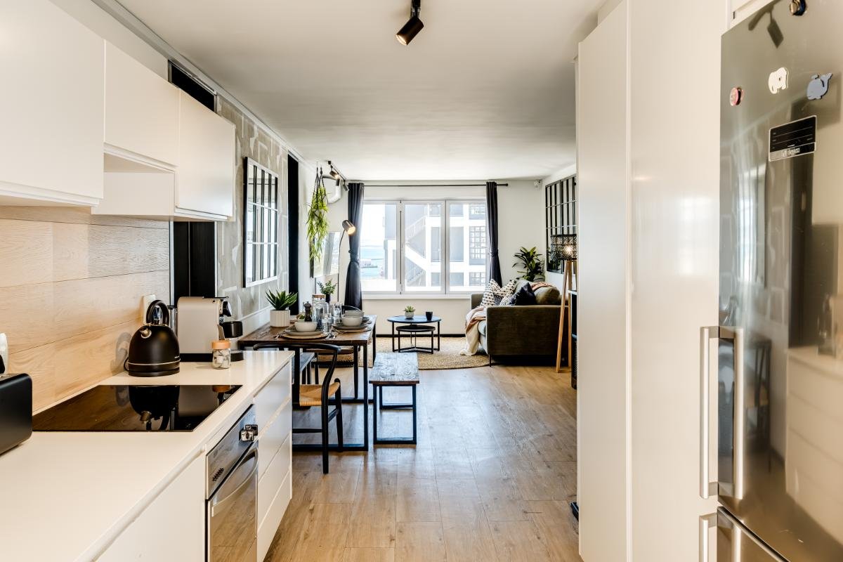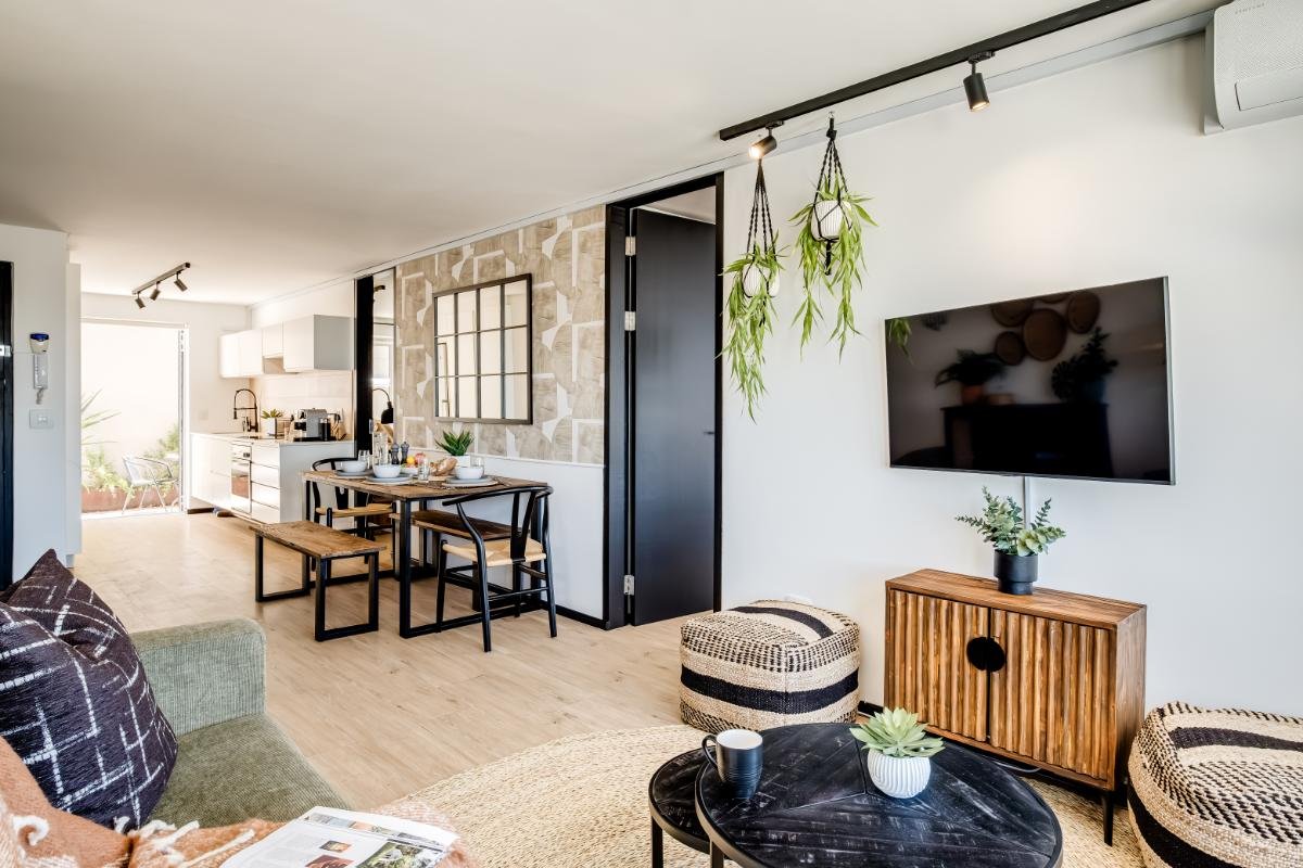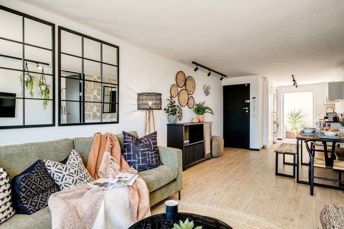 The open-plan kitchen is fully equipped with an electric hob, Nespresso machine, dishwasher, and washer, with access to a cosy courtyard for a quiet escape. The living and dining area, with seating for four, is the perfect spot to unwind with its air conditioning, TV, and lovely city and sea views.